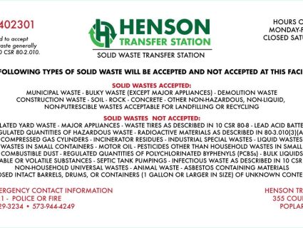 We cannot accept hazardous materials, including: major appliances with refrigerants, lead acid batteries, liquid wastes, motor oil, pesticides, flammable/explosive materials, asbestos, and other regulated substances. See facility signage or contact us with questions about specific materials.